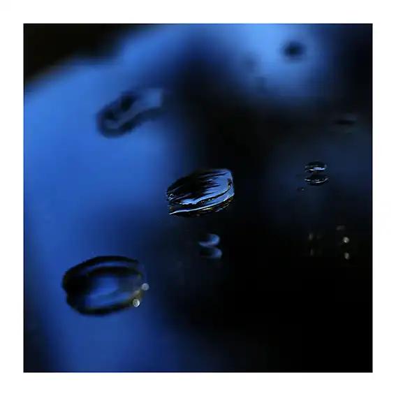 Entre le noir profond et la gamme des bleus, la surface semble vibrer.