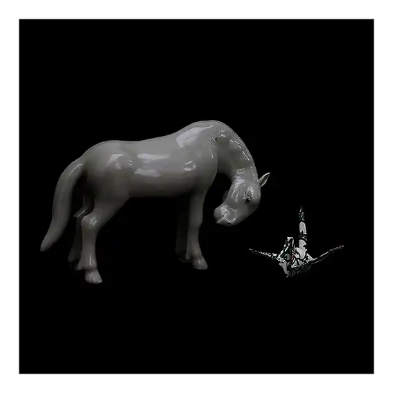 Dans l’obscurité, un cheval de porcelaine s’incline vers un oiseau d’origami.